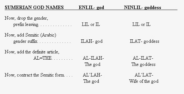 Now, here is the heart of the matter from the linguistic, historic, and epigraphic evidence. Seeing this will help you to follow the migration of the god IL (or LIL) on his way from Sumer to Arabia and Mecca where he became Allah. Start at the top with the Sumerian name for the god and goddess.